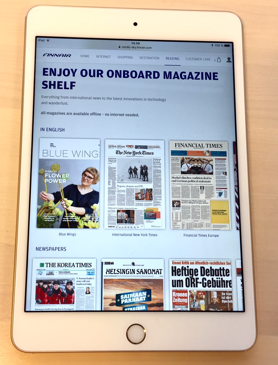 Suomalaisten ikisuosikki Aku Ankka -lehti ei sen sijaan kuulu valikoimaan. Lehteä on aikoinaan jaettu Finnairin lentojen lapsimatkustajille. Aku Ankka -lehti oli yhteistyökumppanina myös Finnairin 90-vuotisjuhlissa (Finnair ja Aku Ankka yhteistyössä 90-vuotispäivillä). Digitaalisia sanomalehtiä voi lukea Nordic Sky -portaalin kautta omilla mobiililaitteilla. Lehden ostoa tai ilmaislehden lukemista varten ei tarvitse ostaa erikseen internet-yhteyttä. Maaliskuun alusta alkaen painettuja sanomalehtiä ei siis enää ole tarjolla tai myynnissä Finnairin Euroopan- ja Lähi-idän-lennoilla. Painettujen lehtien jakelu yhtiön kaukolennoilla päättyi jo aiemmin. Finnairin Airbus-kapearunkokoneisiin asennetaan nettiyhteys kesäkuun 2019 loppuun mennessä. Jos lento kuitenkin liikennöidään jollakin niistä Airbus-kapearunkokoneista, joissa ei vielä ole internet-yhteyttä, ei tarjolla ole myöskään digilehtiä. Yhtiön Euroopan-lentoja operoidaan myös Norran Embraer- ja ATR-koneilla. Niissä ei ole tarjolla nettiyhteyttä. Tälläisillä Norran operoimilla Embraer-lennoilla, on businessluokan matkustajille ja Finnair Plus -platinamatkustajille 1.3. alkaen tarjolla Kauppalehti. Finnair kokeili digilehtitarjontaa valikoiduilla Airbus A350- ja A330-koneilla operoitaville reiteillä kesä-elokuussa 2017. Kaukolentojen Airbus A330- ja A350-koneiden sisäiseen Nordic Sky -portaaliin tuli kokeilun jälkeen keväälllä 2018 luettaviksi digiversiot yli 50 kansainvälisestä sanomalehdestä. Päivitys 1.3: Tarkennettu Finnairin digilehtivalikoimaa. Lue myös: