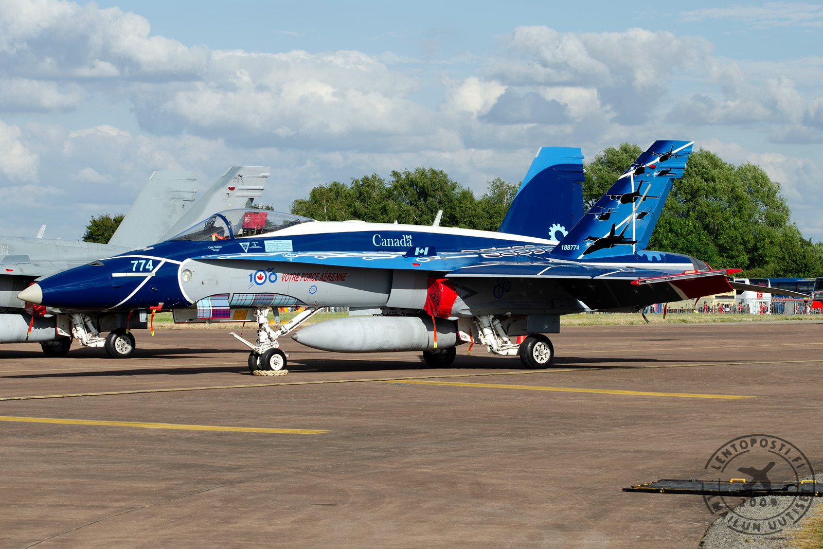 Kanadan ilmavoimien 100-vuotisjuhlissa RIAT:n yllä nähtiin suorituskykyinen esityslento vaahteralippumaan ilmavoimien McDonnell Douglas CF-188A Hornet -hävittäjällä.