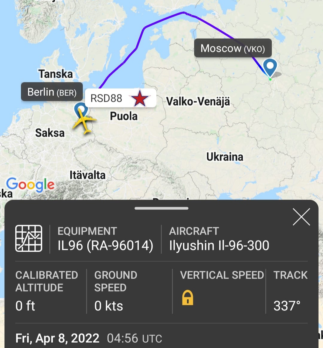 Kyseinen lento RSD88 suuntasi Venäjältä Itämeren kansainvälisen ilmatilan kautta Saksaan ja laskeutui Berliiniin.