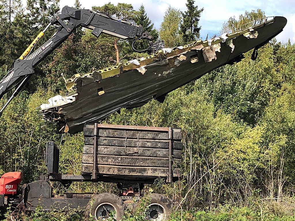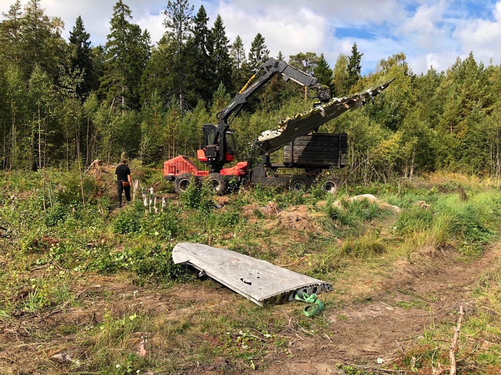 Siirrosta huolehti metsäkoneellaan paikallinen Skogs Järven (kuvassa vasemmalla). Jatkokäsittelystä vastaa niin ikään ahvenanmaalainen Flygfyhren Skrotlager. Tärkeintä oli saada luontoon kuulumattomat materiaalit vihdoin asiallisesti kierrätykseen. Koneen metalliosista saatetaan kuitenkin tehdä joitain muistoesineitä. Koneen ovi päätyy Ahvenanmaan museoon. Svenka YLE:n mukaan myös uhrien omaiset saivat joitain osia muistoksi (kuten ylläolevassa kuvassa näkyvän siivenkärjen). T.T. Lue myös aiempi Lentoposti.fi -juttu aiheesta: