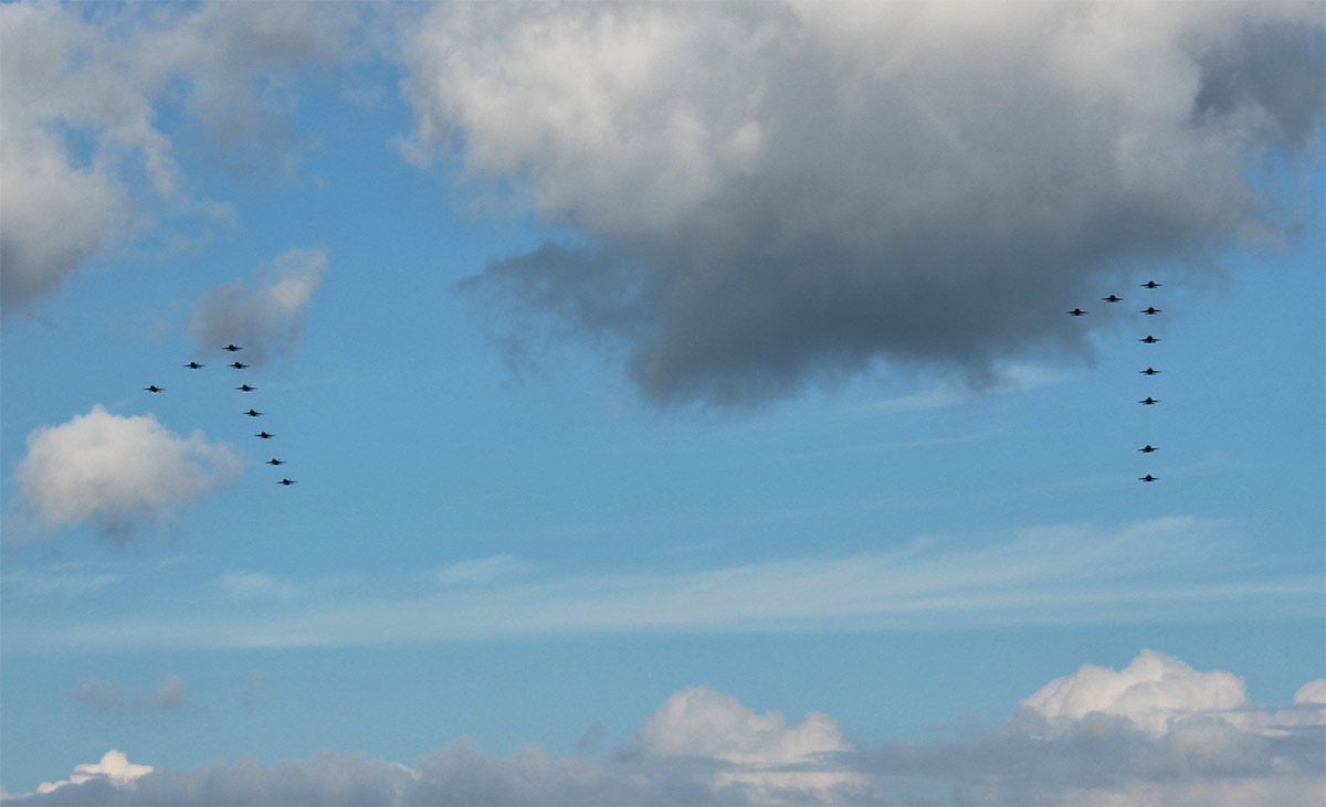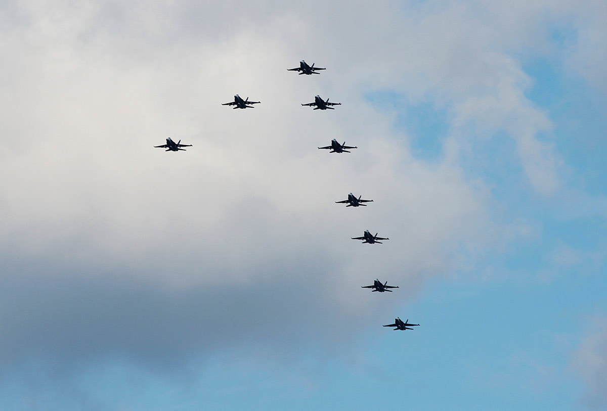 Viimeksi suuri numeromuodostelma nähtiin Rovaniemen yllä elokuussa 2015. Tuolloin ylilennolla ja erikoisella muodostelmalla kunnioitettiin Hävittäjälentolaivue 11:sta historiaa sekä McDonnell Douglas F/A-18 Hornet -kaluston 20-vuotista taivalta Suomen Ilmavoimissa. Taivaalle muodostui 18 Hornet-hävittäjän avulla numero 11 (kuva yllä) Vastaava osastolento ja numero 11 toteutettiin myös Hornetia edeltäneellä Saab J 35 Draken-kalustolla vuonna 1998. Kun viimeinen kokoonpanosta valmistunut Hornet-hävittäjä luovutettiin Ilmavoimille Patrian Jämsän Hallin tehtailla vuonna 2000, tilaisuutta kunnioitti läsnäolollaan presidentti Martti Ahtisaari. Tuolloin vaikuttavassa ylilennossa nähtiin 18 Hornetia kolmessa kuuden koneen muodostelmassa. Aikalaiskuvien perusteella korkeutta oli vähemmän kuin nykyisillä ylilennoilla. T.T. MH YLE Uutisten juttu Lue myös: