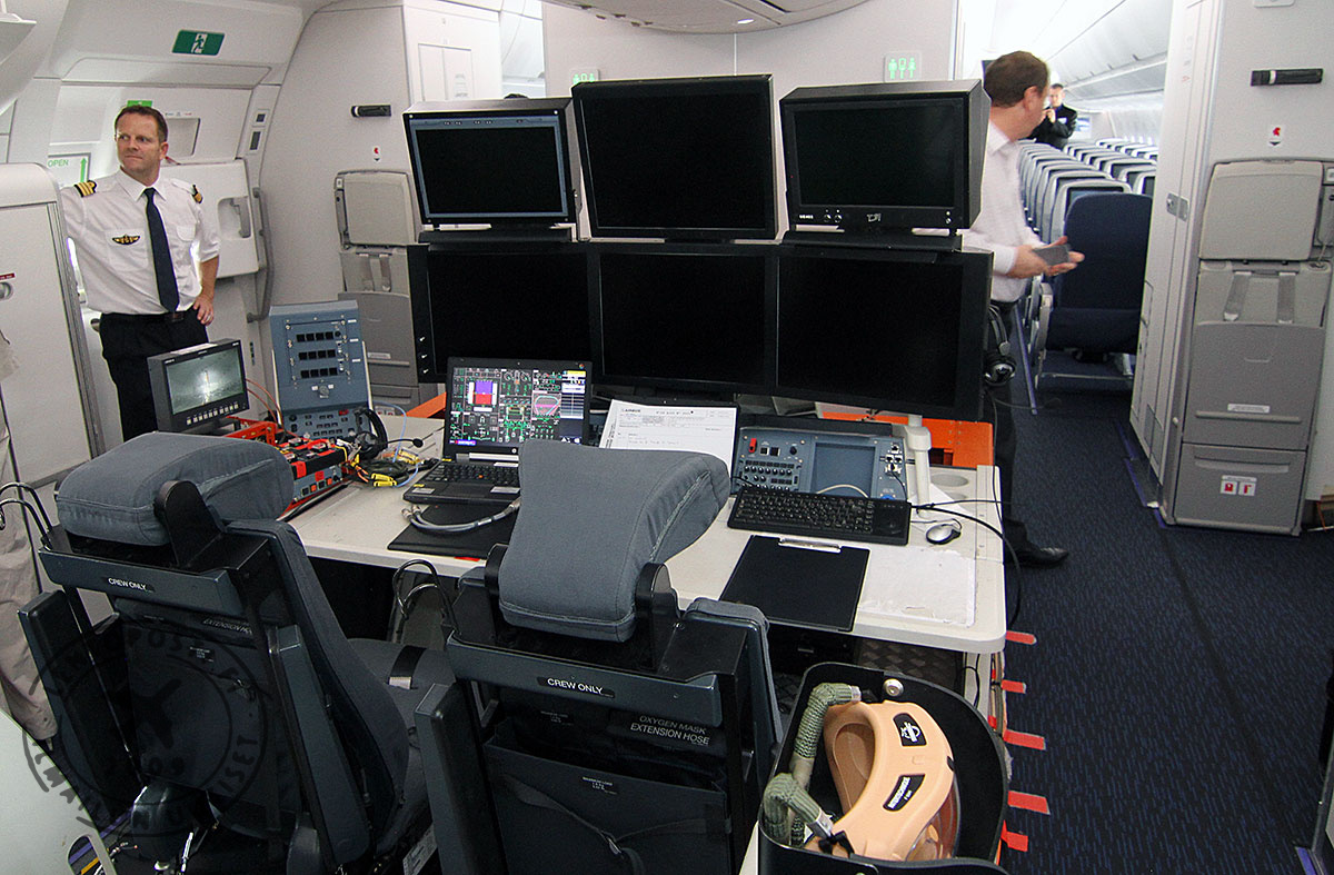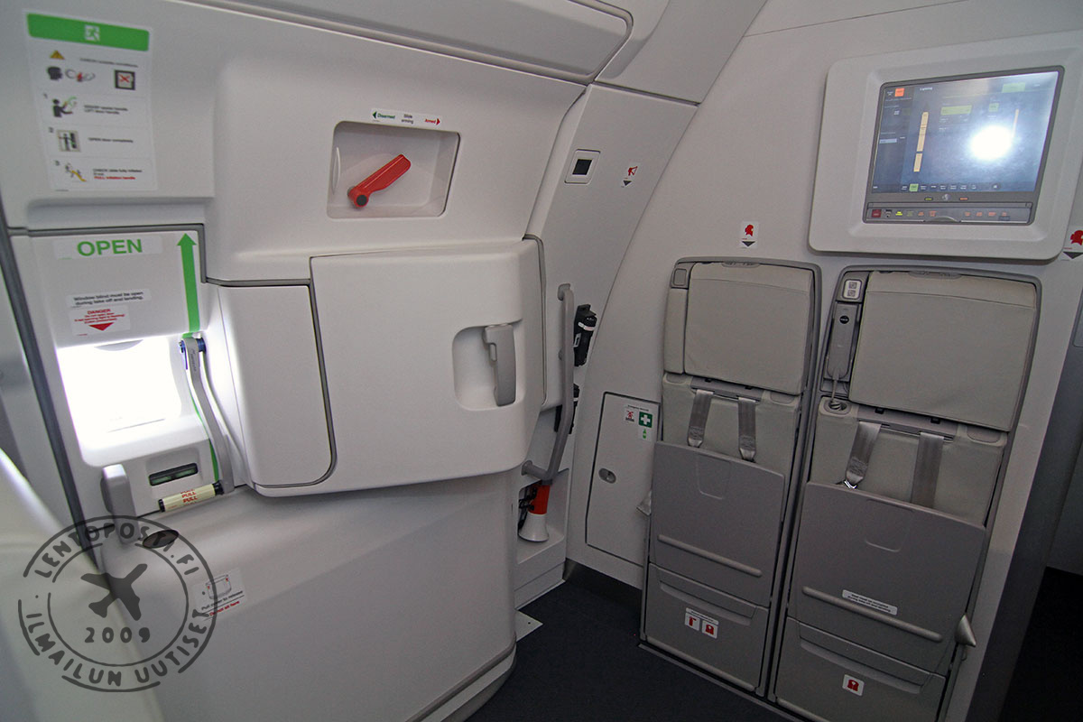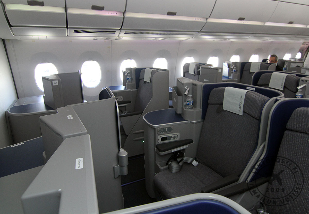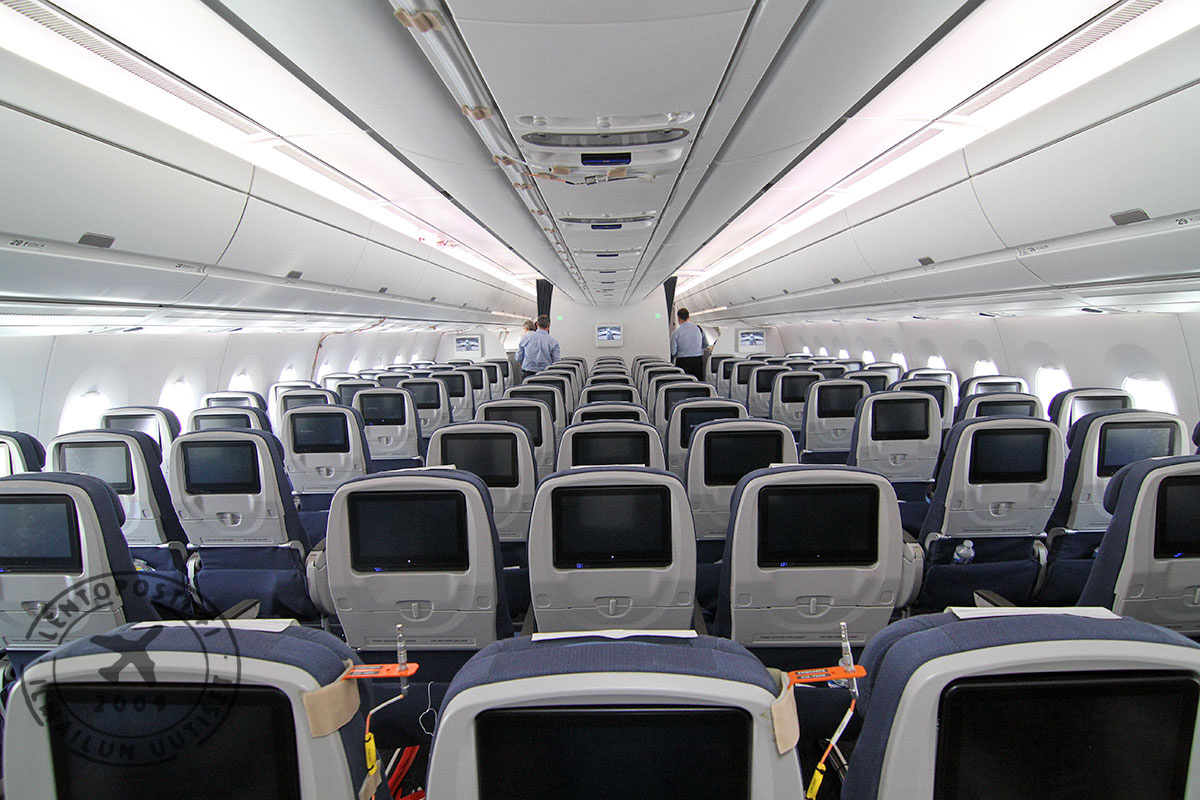 Ensimmäistä matkustamolla varustettua Airbus A350 XWB -konetta ohasivat kokeneet koelentäjät kapteeni Peter Chandler ja Lentoposti.fi:n lukijoillekin tuttu kapteeni Frank Chapman. Kameroitaan käyttänyt toimittajajoukko ja Airbusin työntekijäryhmä astelivat innokkaina pitkin matkustajasiltaa kohti matkustamoa. Jo etukeittiöstä huomasi uuden koneen tilan tunnun. Valoisa matkustamo kutsui kaikki omille paikoilleen.