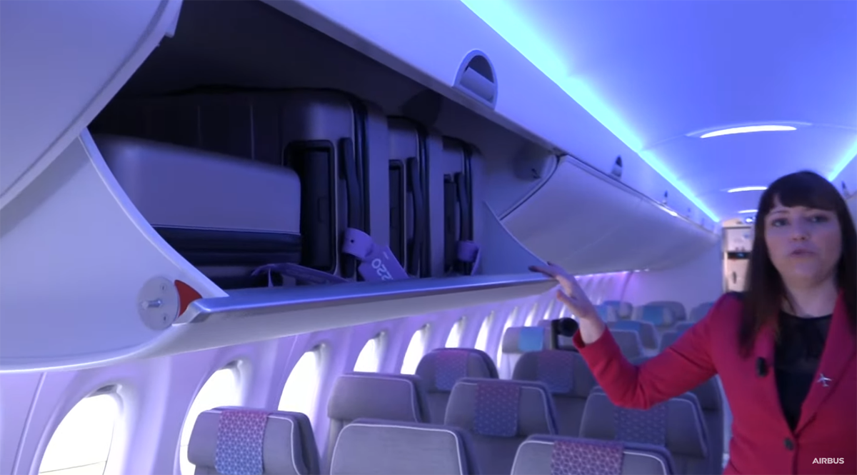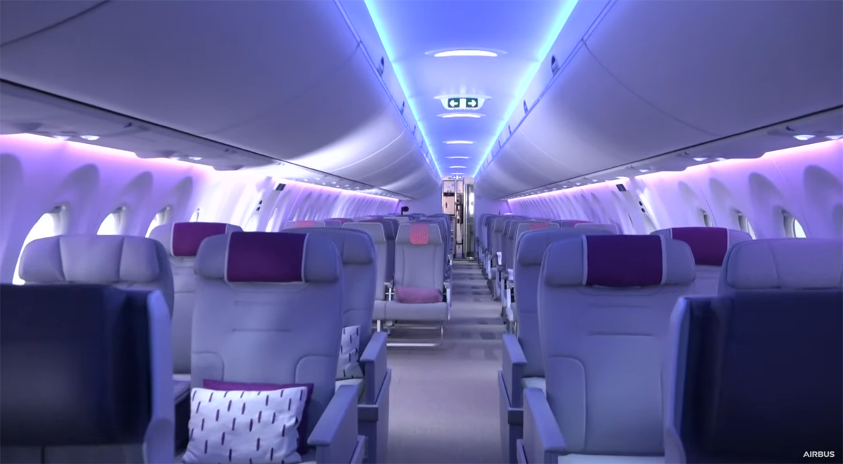 Matkustusmukavuudesta Airbus mainitsee leveät istuimet, jotka mahdollistavat eri asentojen ottamisen lennon aikana. Lisäksi jokaisella rivillä on oma kokonainen ikkuna, joka lisää ikkunapaikkojen kysyntää.
