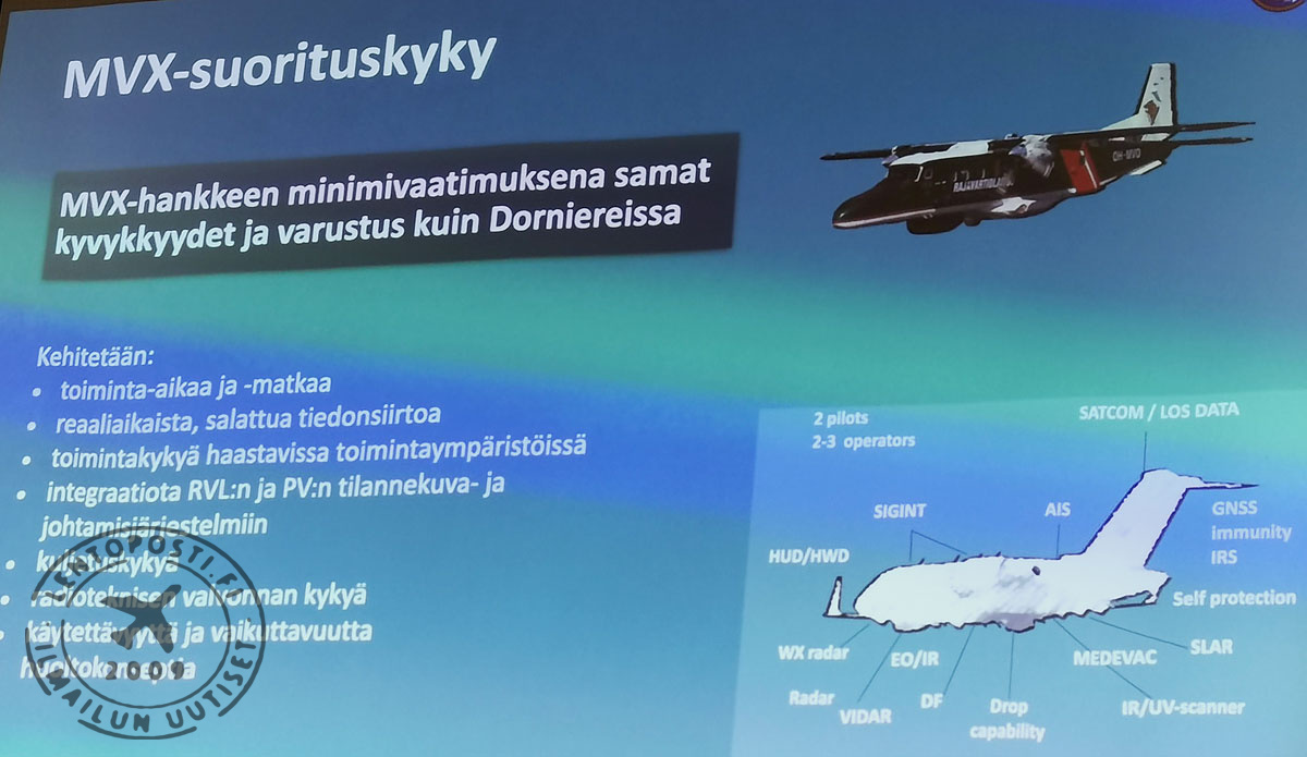 Niinpä ensimmäinen käyttöön otettava uusi MVX-monitoimivalvontakone saa rekisteritunnuksen OH-MVX ja sen sisarkone tunnuksen OH-MVY. Nyt MVX-hanke on saatu merkittävään tilausvaiheeseen, josta edetään aikanaan koelento- ja toimistusvaiheisiin. Rajavartiolaitoksen ilma-alushankinnat kuitenkin jatkuvat, sillä seuraavaksi on käynnistymässä HekoX-hanke, joka tulee olemaan Rajavartiolaitoksen historian suurin ilma-alushanke (Lue uutisemme aiheesta: Rajavartiolaitos käynnistää HekoX-hankkeen – tavoitteena yhtenäinen helikopterilaivasto). MH Lue myös aiemmat MVX-aiheiset uutisemme vuodesta 2016 lähtien, jolloin kerroimme tulevasta valvontalentokonehankkeesta ensimmäisen kerran: