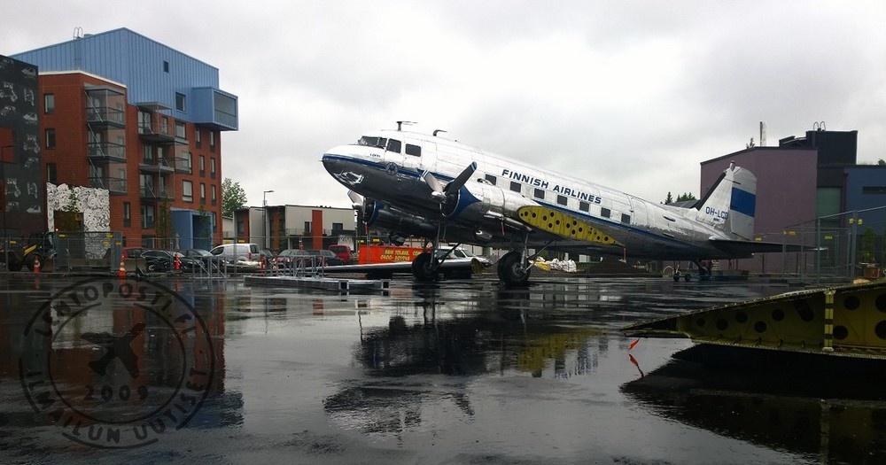 Suomen Ilmailumuseolta yhdistelmä eteni reittiä Tietotie - Mekaanikontie - Aviabulevardi - Tikkurilantie - Riipiläntie - Murtotie pitkin. Hinaus käynnistyi museon pihalta kello 23.45. Aviabulevardilta liikenne suljettiin kello 24. Asuntomessualueelle kesän sijoituspaikkaansa DC-3 pääsi lopulta aamuviideltä. Kone nostetaan teräskehikkojalustalle ympäristöään ylemmäksi. Otsikkokuvassa Lokki on odottamassa nostoa aukiolla, jolla se on näytteillä Asuntomessujen ajan. +TT+ Airveteran Oy:n nykyisin omistama Douglas DC-3 (Douglas Commercial 3, sotilasversiona C-47A) hankittiin Aeron (nykyisin Finnair) käyttöön vuonna 1947 Yhdysvaltojen sodan aikaisen kaluston ylijäämävarastoista. Se rakennettiin 1943 Douglasin Long Beachin tehtailla Kaliforniassa. Myöhemmin sieltä tulivat lukuisat Finnairin koneet aina MD-11-aikaan asti. Koneen sarjanumero on 19309. Suomessa se sai rekisteritunnuksen OH-LCD ja lempinimen “Lokki”. Kesäkuun 26. päivänä vuonna 1952 Charlie Delta laskeutui lentokapteeni Wolmar Laurilan ohjaamana kaikkien aikojen toisena koneena silloin vielä keskeneräiselle Seutulan lentoasemalle. Lokki lensi matkustajaliikenteessä vuoteen 1966, jonka jälkeen sitä käytettiin vielä rahtilennoilla ja Maanmittaushallituksen kartoituskoneena. Ilmavoimien kuljetuskoneena Lokki lensi tunnuksella DO-8. Kone poistettiin aktiivikäytöstä vuonna 1984. Sen viimeinen lento tehtiin 1986. Airveteran Oy kunnosti Lokkia 90-luvulla, jonka jälkeen se on ollut ulkosäilytyksessä useissa eri paikoissa Helsinki-Vantaan lentoasemalla. Toista Airveteranin DC-3-konetta (OH-LCH) lennetään edelleen. Lue myös: