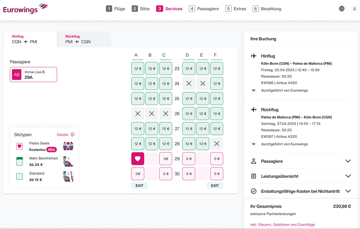 Eurowings on ensimmäinen eurooppalainen lentoyhtiö, joka tarjoaa ainutlaatuista Flieb's Seat -palvelua. Yhtiön Airbus A320 -koneiden takaosiin tulee myös Connecting Flight -alue, joissa jokaisen rivin keskipaikka on vapaana. Täällä on mahdollista tavata joku erityinen ja ensivaiheessa tämä paikkavalinta on maksuton.