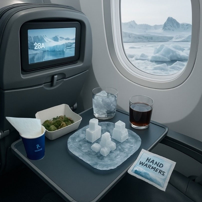 Yhtiön lennoilla matkustajat saavat istumapaikkojensa eteensä polkimet, joiden avulla tuotetaan tarvittava voima lentoonlähtöihin sekä matkalentovaiheeseen. Mitä kovempaa matkustajat polkevat sitä nopeammin lento on määränpäässä. Matkustajat saavat ilmaista kuntoilua ja kovimmille polkijoille on luvassa enemmän jalkatilaa. Lisäksi kanta-asiakasohjelman pisteitä kertyy jokaisesta poljetusta kilometristä. Lähde: Alliance Airlines Facebook Norse Atlantic Airways aloittaa suorat lennot Lontoon Gatwickistä ja New Yorkista Antarktikselle Trollin tutkimusasemalle. Economy Freeze -luokan matkustajille on luvassa käsin kaiverrettuja jääcanapéitä, Antarktiksen salaattia ja jäätikkönäkymät, ilmaiset lumilasit sekä käden lämmittimet. Premium Freeze -luokassa tarjoillaan jäätikköcocktaileja ja kaiverrettuja jääalkupaloja. Tarjolla on myös vastamelusuojalla varustetut korvaläpät, joita voi käyttää määränpäässä tavatessaan pingviinejä. Kaikille matkustajille on luvassa Freeze Class -paketti, joka sisältää lämpökerraston, sääsuojatun teltan ja norsensinisen tutkimusmatkailijan parka-takin.