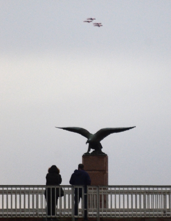 Kauhavalta lähtö liittyy Puolustusvoimien uudistukseen. Aiemmin on jo suljettu Hallin varuskunta ja järjestelty toimintoja eri tukikohtien välillä. Nyt Hornet-hävittäjät on sijoitettu Rissalaan ja Rovaniemelle, vaikka ne tarvittaessa voivat päivystää muuallakin. Ilmavoimien harjoituskoneet ovat tulleet Pohjanmaalla tutuiksi vuodesta 1927 alkaen. Tänään 3. joulukuuta neljän BAE Systems Hawk -suihkuharjoituskoneiden osasto kiersi hyvästelemässä 11 Pohjanmaan paikkakuntaa. YLE lähetti koneiden lähdön Kauhavalta livenä netissä. Esimerkiksi Vaasassa Kotka-patsan ympäristöön oli ylilentoa (kuvassa alla) seuraamaan kerääntynyt muutamia kymmeniä katsojia tihkuisesta ja pilvisestä säästä huolimatta. Patsas on sijoitettu lähelle paikkaa, johon ruotsalaisen Eric von Rosenin Suomelle lahjoittama Thulin Typ D -kone laskeutui 6. maaliskuuta 1918. Sitä pidetään Ilmavoimiemme alkuna.