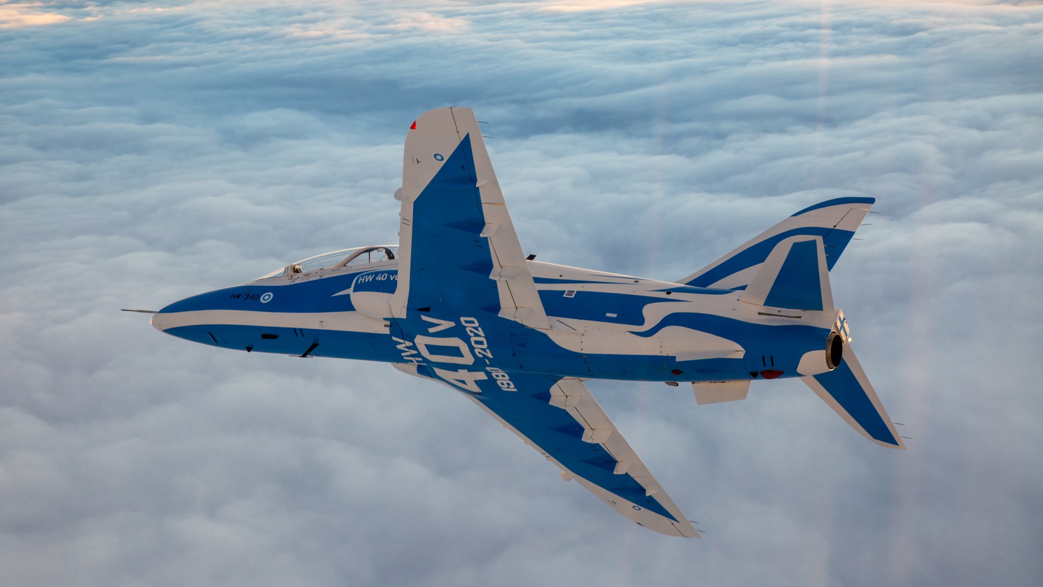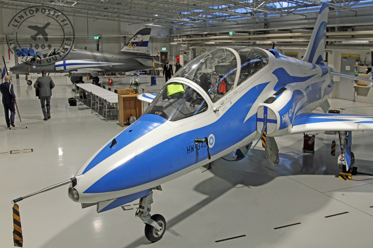 Ilmavoimat juhlistaa BAE Systems Hawkien 40-vuotista lentoa Suomessa näyttävästi erikoismaalatulla Hawk-suihkuharjoituskoneella. Juuri modifikaatiosta valmistunut Hawk Mk51 HW-340 on saanut pintaansa sinivalkoiset värit ja koneyksilö esiteltiin juhlatilaisuudessa Tikkakoskella.