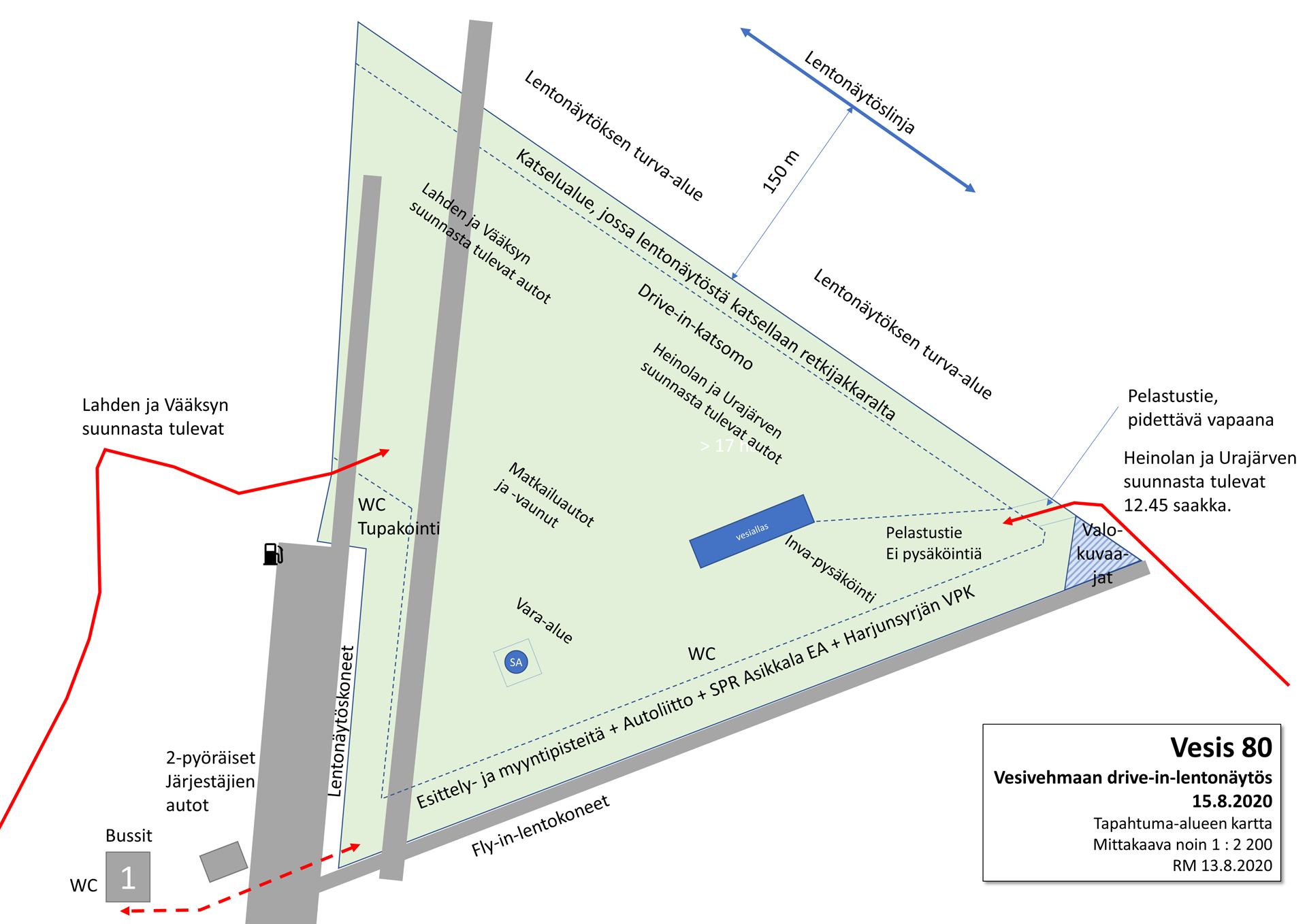 Lentonäytös järjestetään Vesivehmaan lentokentällä, osoite Lentotie, 17130 VESIVEHMAA. Ohjaus Urajärventien ja Lentotien risteyksestä Lahden ja Vääksyn suunnasta tuleville ja Urajärventie 263:n kohdalta Heinolan ja Vierumäen suunnasta tuleville.