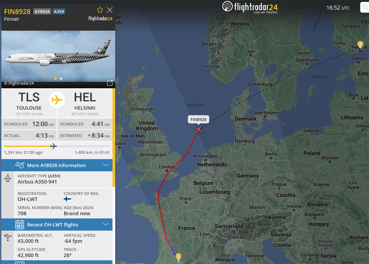OH-LWT saapuu Helsinki-Vantaalle tiistai-iltana noin kello 20.30. Siirtolento AY8928 ei kulje Suomeen aivan suorinta lentoreittiä vaan kiertää Ison-Britannian ilmatilan kautta. Finnair on saanut Saksan, Ranskan ja Yhdistyneiden kuningaskuntien vientiluottolaitoksilta yli 100 miljoonan euron vientiluottotakauksen, joka on saatavilla määritellyille Airbus-koneiden ostajille. Takaus on myönnetty Finnairille 17.12.2024 luovutettuun Airbus A350-900 -lentokoneeseen (OH-LWT). Rahoituksen järjestäjäksi Finnair on valinnut Citibank Europe plc:n.