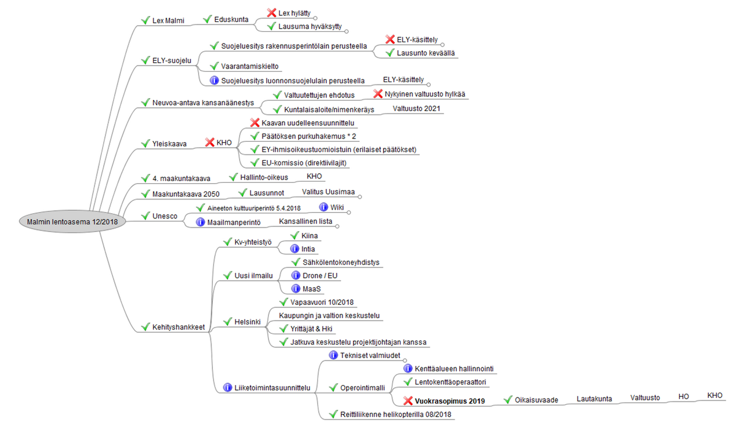 Yhdistys tutkii myös KHO:n yleiskaavapäätöstä ja valmistelee toimenpiteitä Euroopan tasolla. Alueella on voimassa vaarantamiskielto rakennusperintölain nojalla tehdyn suojeluesityksen käsittelyn ajan. Valmisteilla on myös suojeluesitys luonnonsuojelulain perusteella. Kaaviokuvassa yllä on kooste Helsinki-Malmin lentokäytön pelastamiseksi meneillään olleista toimenpiteistä. T.T. Lue myös aiempia Lentoposti.fi -juttuja Helsinki-Malmista: