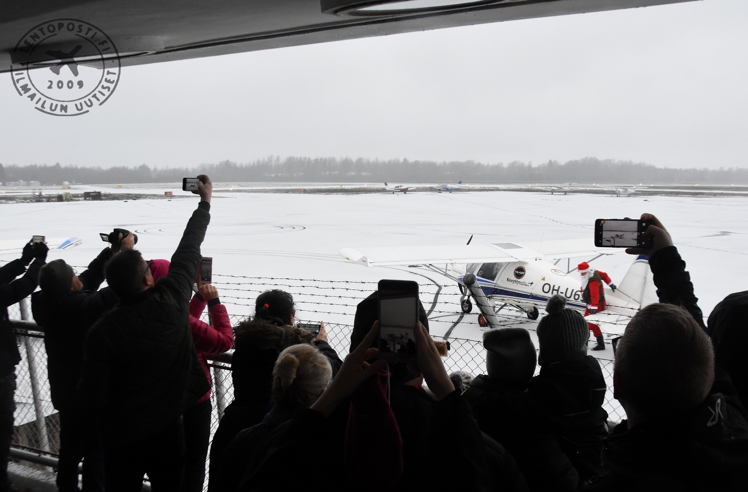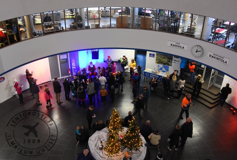Joulupukkia vastassa lentoaseman päärakennuksen eli pyöreän terassilla oli noin sata ihmistä, heistä melkoinen osa lapsia. Sumuinen sää ei toki oikeasti sallinut lentämistä, mutta lasten iloksi Pukki "laskeutui" Ikarus C42C -ultrallaan kiitotielle 36 ja rullasi odottavan yleisön eteen - tosin pyöräyttäen ensin ympyrät seisontatason lumipeitteseen.