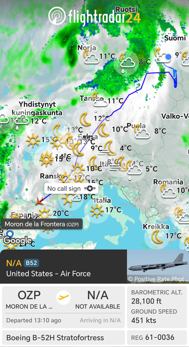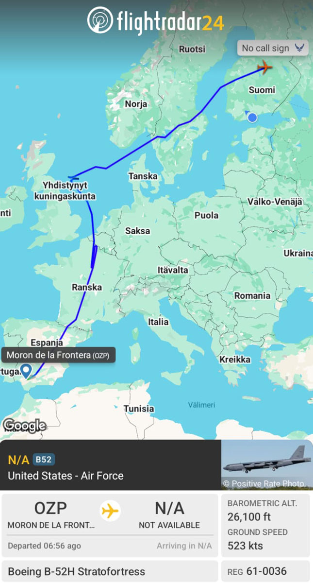 Yhdysvaltain ilmavoimat USAF lähetti B-52H Stratofortress -pommikoneita Eurooppaan Bomber Task Force 26-1 -tehtävälle. Lousianan osavaltion Barksdalen lentotukikohtaan tukeutuvat pommikoneet saapuivat monikansallisen tehtävälleen Morónin tukikohtaan Espanjaan 8. marraskuuta 2025.
