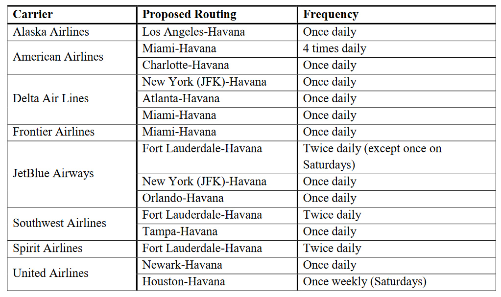 Luvat aikataulunmukaiselle reittiliikenteelle Yhdysvalloista Havannaan saivat Alaska Airlines, American Airlines, Delta Air Lines, Frontier Airlines, JetBlue Airways, Southwest Airlines, Spirit Airlines ja United Airlines.