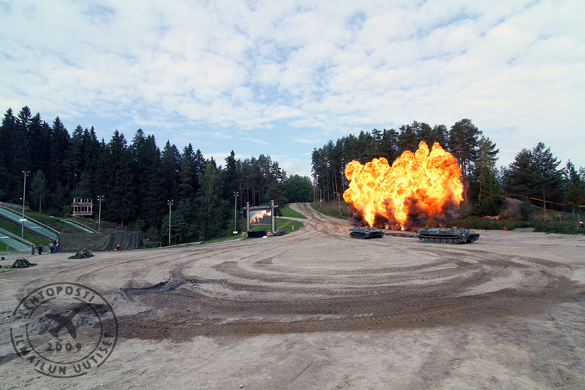 Maksuttomat taistelunäytökset järjestetään messukeskuksen vieressä Karpalon kentällä. Näytökset ovat perjantaina kello 10.30 ja 13.30 sekä lauantaina kello 11.00 ja 14.00 Katsojat pääsevät seuraamaan todentuntuntuista taisteluskenaariota, jossa on mukana uusinta Leopard 2A6 -panssarikalustoa, erilaisia panssarintorjunta-aseita, olalta laukaistava lämpöhakuinen Stinger-ilmatorjuntaohjus sekä runsaasti toimintaa simuloivaa pyrotekniikkaa. Mukana on myös Hornetin jättinäytöllä simuloituna pudottama JDAM-täsmäpommi (Joint Direct Attack Munition), jonka osuma aiheuttaa taistelunäytöksen vaikuttavimmat pyroefektit (lue lisää linkin jutusta).