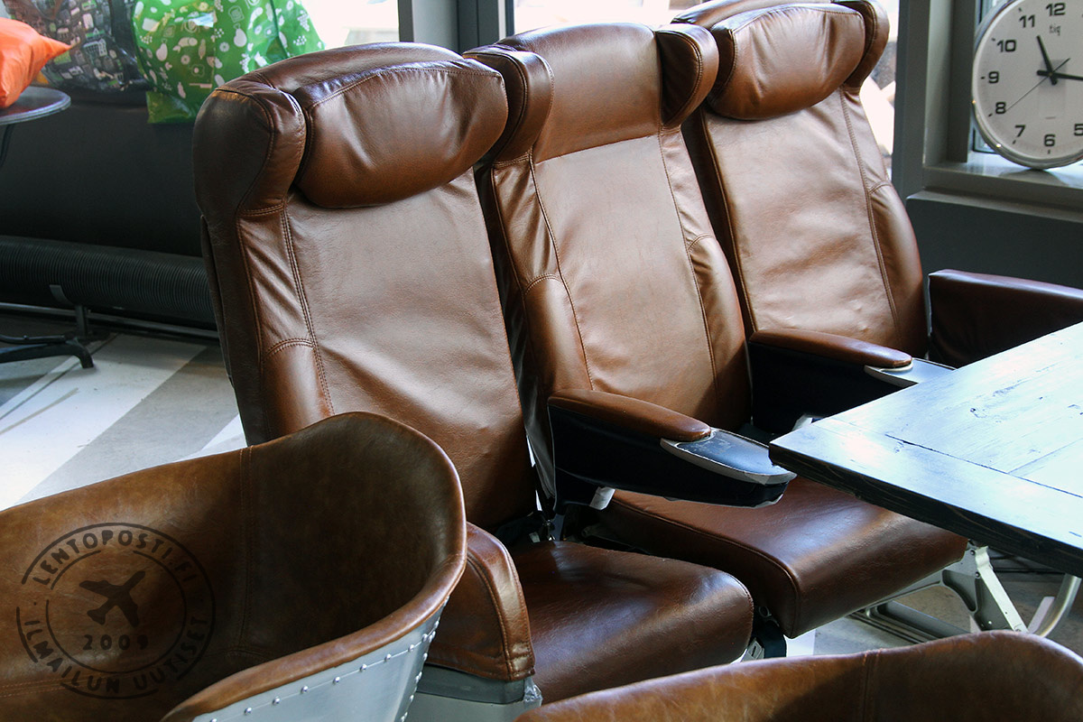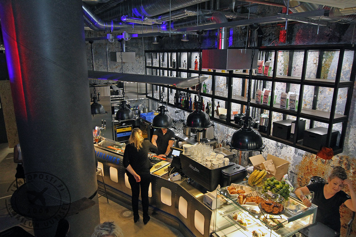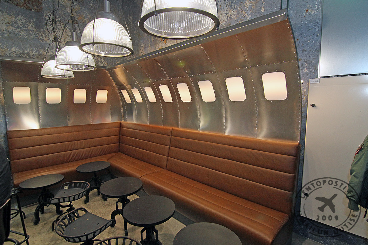 Hangaari-ravintolan baaritiski on mukailee Douglas DC-3 -koneen runkoa ja tiskin päästä löytyy ilmailuaiheinen lounge-tila. Osa katsomoalueen penkeistä on aiemmin toiminut Boeing 737 -koneen matkustajaistuimina. Ulkoterassin pöydiksi on löydetty lentojoukkojen polttoainesäiliötynnyrit.