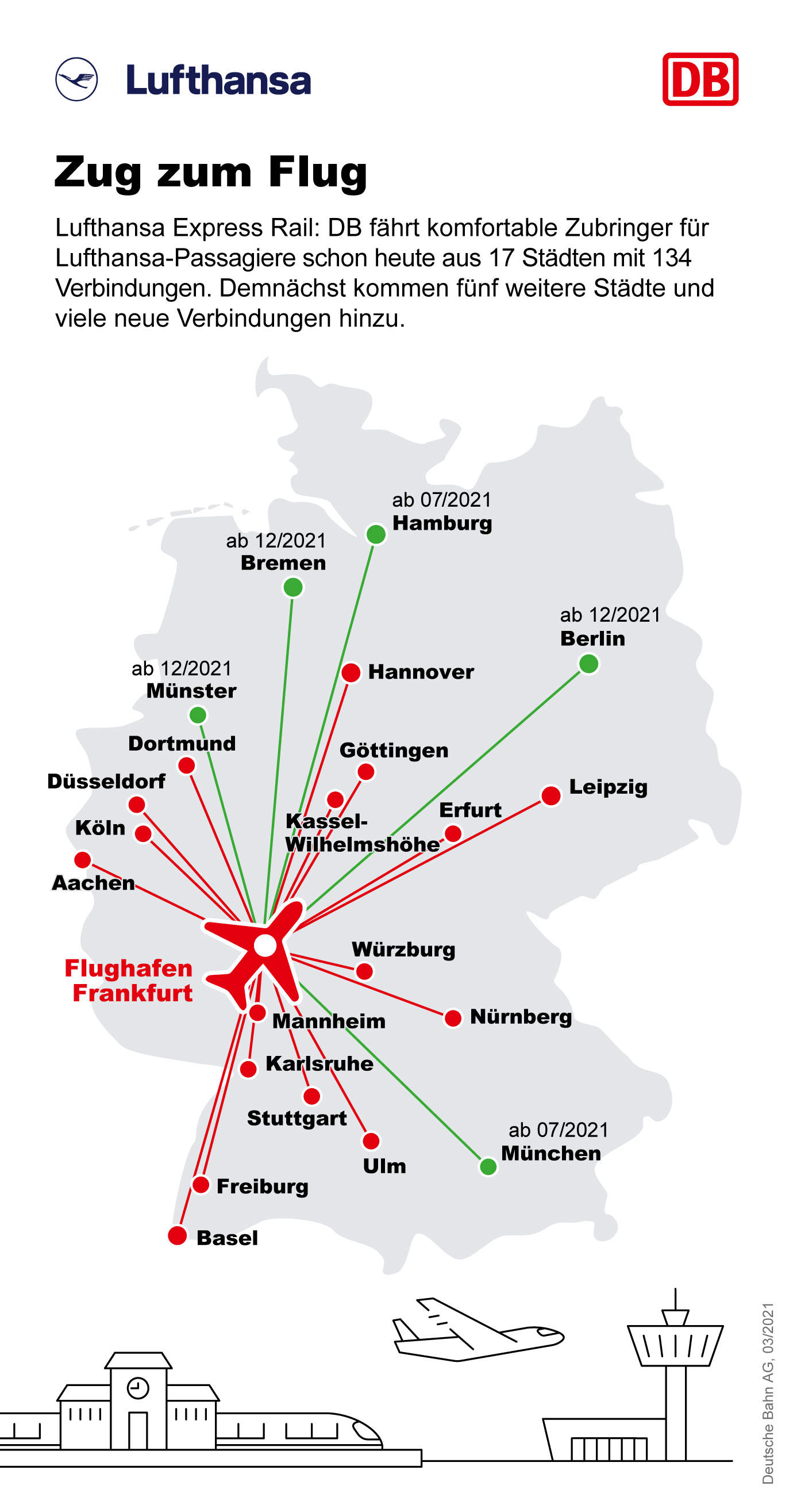 Edellisten lisäksi joulukuussa 2021 DB nopeuttaa junayhteyksiä Münchenin ja Kölnin välillä alle neljään tuntiin. Münchenistä ja Nürnbergistä avataan suora junayhteys ilman välipysähdyksiä Frankfurtin lentoasemalle. Tällainen yhteys on tarjolla kahdesti päivässä. Matka-ajat ovat vastaavasti kolme tuntia ja kaksi tuntia. Välipysähdysten poistamisella yhteys nopeutuu puolella tunnilla ja aikataulut on suunniteltu toimiviksi jatko- ja paluulennoille. Lufthansa Express Rail -palveluun kuuluvat paikanvaraus juniin, takuu yhteyksien pitävyydestä, Miles & More -lentomailien kertyminen sekä DB:n loungetilojen käyttö tietyille matkustusluokille. Myös Lufthansan palvelut ovat käytössä junan wifi-yhteydellä. Ensimmäisen ja business-luokan matkustajille tarjolla on myös DB premium -palvelu, joka sisältää ilmaista ruokatarjoilua junassa. Tulevaisuudessa luvassa on myös lisäpalveluita. Express Rail -palvelun piiriin kuuluvat junat on helppo tunnistaa DB:n ja Lufthansan brändeistä useissa vaunuissa. Myös matkalaukkujen kuljettamisen junassa luvataan olevan helpompaa, kun DB:n käyttää viimeisimmän sukupolven junia, joissa on suuret matkalaukkutilat.