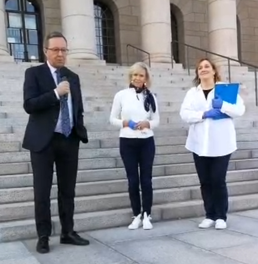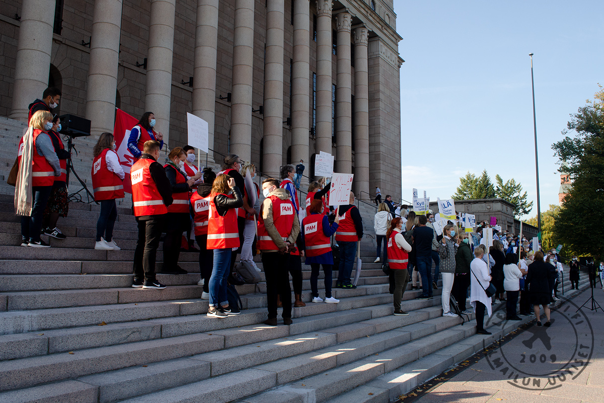 Edustuntatalolle kokoontui iltapäivällä reilut 200 matkailualan edustajaa. Mielenilmauksessa oli mukana myös noin parikymmentä kuljetusalaa edustavaa linja-autoa, joiden torvet soivat matkailualan puolesta. "Palvelua ja työtä - sanomme kyllä" -huudot raikasivat eduskunnan edustalla. Mielenilmauksen koolle kutsujan SMAL:n puheenjohtaja Anne-Marjut Väänäsen lisäksi eduskunnan portailla puhuivat myös mm. Suomen lentoyhtiöedustajien tervehtyksen tapahtumaan tuonut Pekka Mäkinen, PAM:n puheenjohtaja Annika Rönni-Sällinen sekä kansanedustajat Liike Nyt -eduskuntaryhmän Harry Harkimo, Atte Harjanne (vihr.) ja Niina Malm (sd.)