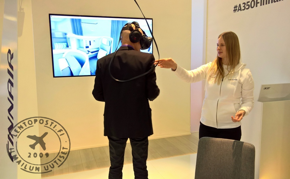 Helsingin Messukeskuksessa on viikonloppuna esillä 994 näytteilleasettajaa 87 maasta. Tapahtuma levittäytyy 10 342 neliömetrin alueelle. Viime vuonna messuilla kävi 72 000 matkailusta kiinnostunutta. Heistä 19 500 oli alan ammattilaisia. Torstain mediapäivän perusteella tapahtuman suosio vaikuttaa jatkuvan samankaltaisena. Aamun ensituntien hiljaisemman hetken jälkeen Messukeskuksen halleissa oli ajoittain jopa pientä tungosta. Matka Nordic Travel Fair, kuten nimi virallisesti kuuluu, onkin Messukeskuksen suosituimpia tapahtumia. Vain Vene-messut ajaa siitä ohi. Kyseessä on Pohjois-Euroopan suurin matkailualan tapahtuma. Takavuosina lentoyhtiöt ovat olleet perinteisesti näyttävästi mukana Matkamessuilla. Silloin pääoven kautta sisään tuleva näki ensimmäisenä Finnairin suuren osaston. Sitä vastapäätä oli useina vuosina niin ikään kotimaisen Blue1:n lähes yhtä suuri näyttelyosasto. Lippukauppa on siirtynyt nettiin ja messuille osallistuminen on varsin kallista. Finnair olikin poissa muutamia vuosia, mutta on jälleen palannut näytteilleasettajien listalle. Yhtiön valkoisuutta hohtava osasto olikin helppo löytää riemunkirjavasta messutarjonnasta. Osastolta ei löydy perinteistä Airbusin pienoismallia tai itse asiassa edes yhtään kuvaa lentokoneesta. Sen sijaan tarjolla on virtuaalinen tutustuminen uuden A350 XWB -koneen business-luokkaan. Kävijä istutetaan tuolille ja hän saa päähänsä virtuaalilasit ja kuulokkeet. Käsiin otetaan peliohjaimia muistuttavat kapulat ja sitten ohjelma käynnistyy. Lasien näkymä seuraa pään liikkeitä ja vaikutelma on hämmästyttävän todenmukainen. Lisäkicksejä haluavat voivat käsikapulalla osoittaa kuvaketta, joka siirtää käyttäjän seisomaan lentävän A350:n siivelle. Näkymä on täydet 360 astetta ja jos rohkeutta riittää, siivellä voi myös kävellä. Katsojat ja vuoroaan odottavat voivat seurata virtuaalivierailua suurelta näytältä (otsikkokuvassa).