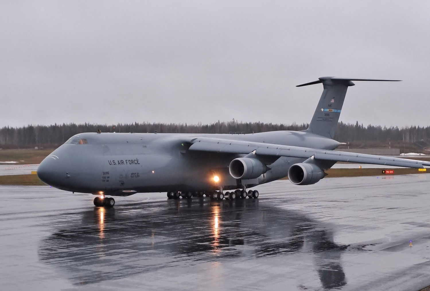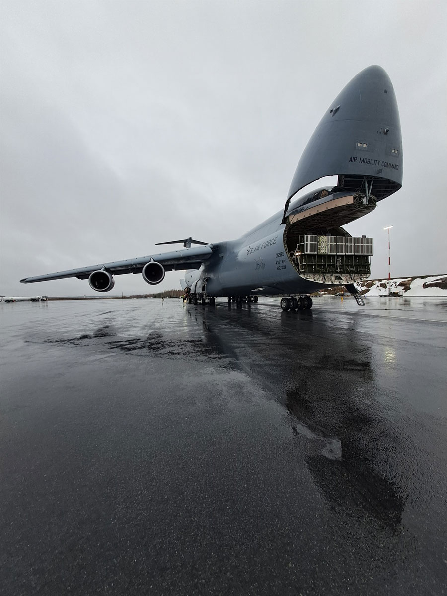 Laivueen materiaalia saapui Pirkkalan tukikohtaan 10. marraskuuta USAF:n Lockheed C-5M Super Galaxy -kuljetuskoneella. Tämä jättikone mahdollistaa joukkojen ja materiaalin yhtäaikaiset siirrot mannerten välillä. USAF:n C-5M Super Galaxyn tukeutuminen Pirkkalaan on osoitus Puolustusvoimien kyvystä vastaanottaa ja purkaa maailman suurimpia sotilaslentokoneita. Edellisen kerran Galaxy on käynyt tiettävästi Suomessa ja Pirkkalassa joulukuussa 2005.