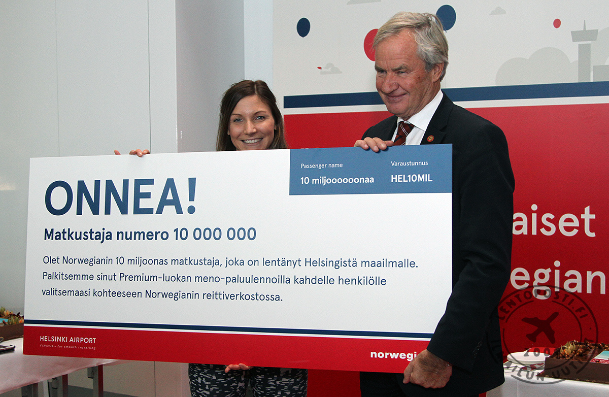 "Ylitimme 10 miljoonan matkustajan rajan Helsinki-Vantaalla ja avaamme kaksi uutta reittiä Helsingistä Eurooppaan. Kohteet ovat Amsterdam ja Pristina", sanoin Norwegianin toimitusjohtaja Bjørn Kjos Helsinki-Vantaalla. Kymmenen miljoonan matkustajan merkkipaalun kunniaksi Norwegianin toimitusjohtaja Bjørn Kjos vieraili lentoasemalla ja lanseerasi kaksi uutta suoraa reittiä, jotka ovat Amsterdam ja Pristina. Lennot Alankomaiden ja Kosovon pääkaupunkeihin alkavat keväällä 2017. Uusien kohteiden myötä Norwegianilla on lähes 40 suoraa reittiä Helsinki-Vantaalta. Skandinavian pääkaupunkien kautta olevien hyvien yhteyksien ansioista Suomesta lähtevät matkustajat voivat hyödyntää myös Norwegianin 140 kohteen reittiverkostoa Euroopassa, Pohjois-Afrikassa, Lähi-idässä, Thaimaassa, Yhdysvalloissa ja Karibialla. Norwegianin toimitusjohtaja Bjørn Kjos yllätti tänään myös matkustajan numero 10 000 000 Helsinki-Vantaan lentoasemalla. Jenna Jokela saa kaksi meno-paluulippua Premium-matkustamossa valitsemaansa Norwegianin kaukokohteeseen. Norwegian lanseerasi ensimmäiset lentonsa Helsinki-Vantaalta vuonna 2010. Sen jälkeen yhtiö on kehittänyt reittiverkostoaan, joka kattaa tällä hetkellä 38 suoraa lentoa Eurooppaan ja Dubaihin Arabiemiirikunnissa. Vuonna 2011 Norwegian avasi oman tukikohdan Helsinki-Vantaalla. Norwegian lentää myös kotimaan lentoja Suomessa Helsingin sekä Ivalon, Kittilän, Oulun ja Rovaniemen välillä. Lisäksi Norwegian lentää Rovaniemen ja Lontoon Gatwickin lentoaseman välillä samoin kuin Oulun ja Las Palmasin sekä Teneriffan eteläisen lentoaseman välillä Kanariansaarilla. "Onnittelemme lämpimästi Norwegiania kymmenen miljoonan matkustajan merkkipaalun saavuttamisesta ja olemme erittäin iloisia Helsinki-Vantaan uusista lentoyhteyksistä Amsterdamiin ja Pristinaan. Tuemme omalta osaltamme reittivalikoiman kasvattamista, jotta matkustajillamme olisi hyvät yhteydet maailman eri kolkkiin. Samanaikaisesti laajennamme Helsinki-Vantaan lentoasemaa, jotta terminaalin seinät eivät olisi tulevaisuuden kasvun edessä", sanoo Finavian toimitusjohtaja Kari Savolainen.