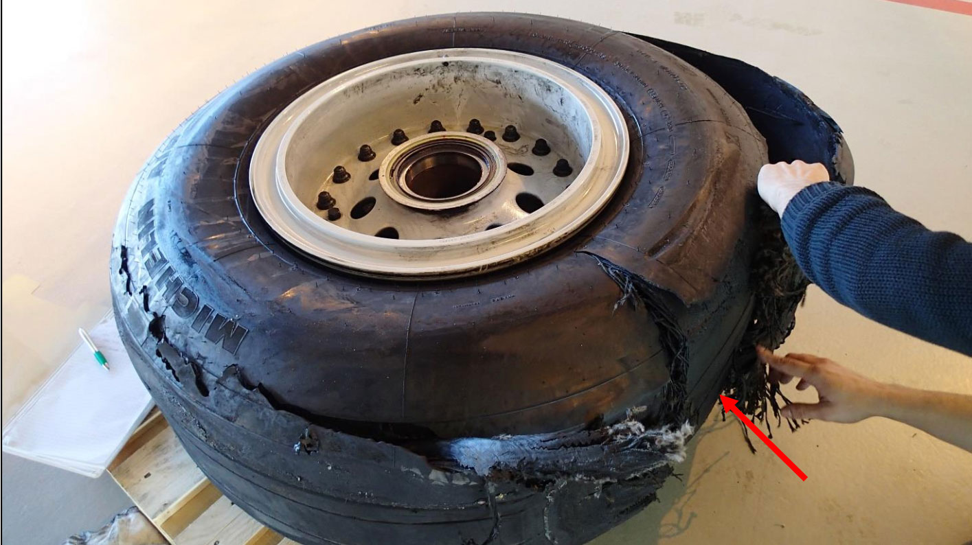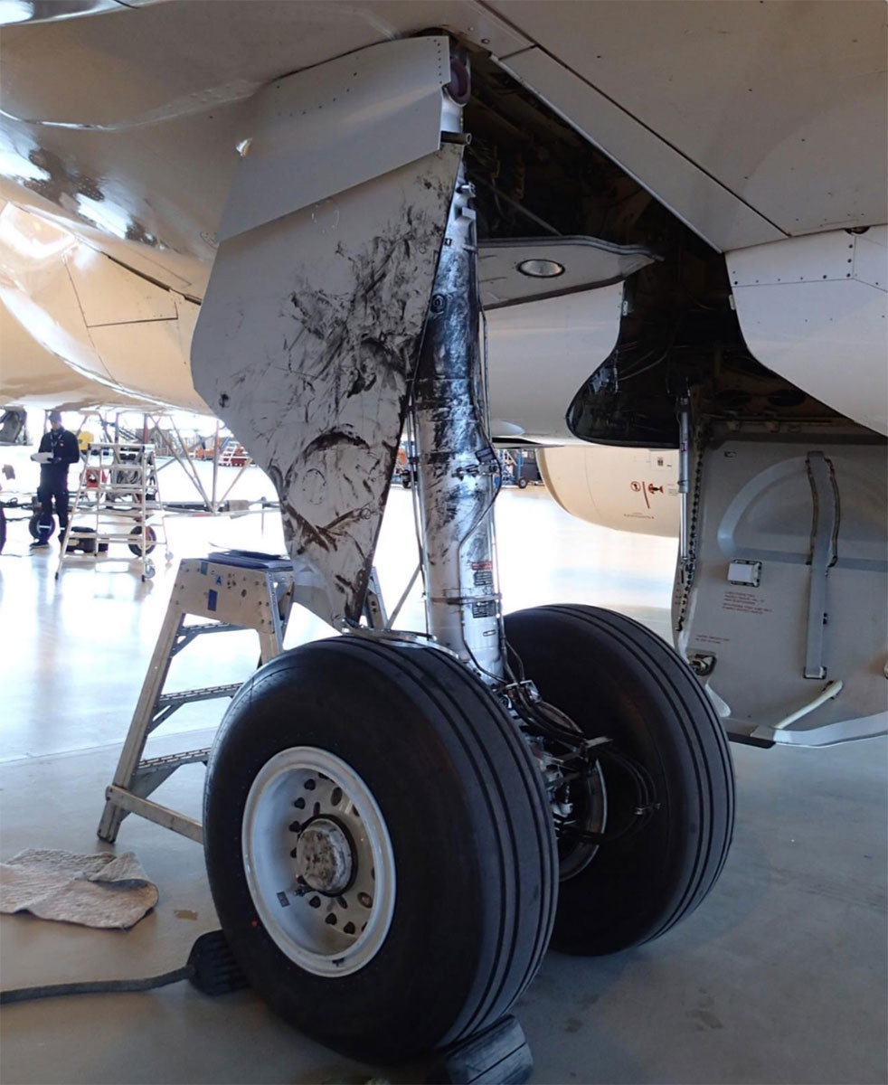Koneen vasemmassa laskutelineessä havaittiin laajalti osin pintavaurioita ja laskutelineen luukun neljästä kiinnikkeestä kolme oli murtunut. Lentokoneen vauriot olivat rajautuneet laskutelineeseen, ja esimerkiksi vasemman siiven laipoissa tai koneen rungon ala-osassa ei havaittu vaurioita. Itse rengas oli vaurioitunut laskutelineen pyörän lukkiumisesta. Rengas oli laahautunut niin kauan, että kulutuspinta oli kulunut loppuun ja hajonnut. Laskussa renkaan kulutuspinta oli irronnut renkaan rungosta ja hakannut vasten laskutelinettä ja laskutelineen luukkua. Rengas itsessään oli uusi eikä sitä siis oltu pinnoitettu uudelleen. Rengas oli ollut kiinni koneessa kaikkiaan 832 nousun ja laskun verran.