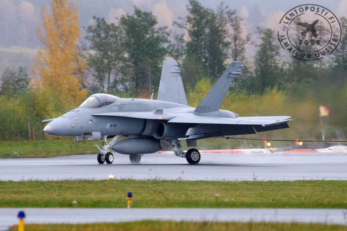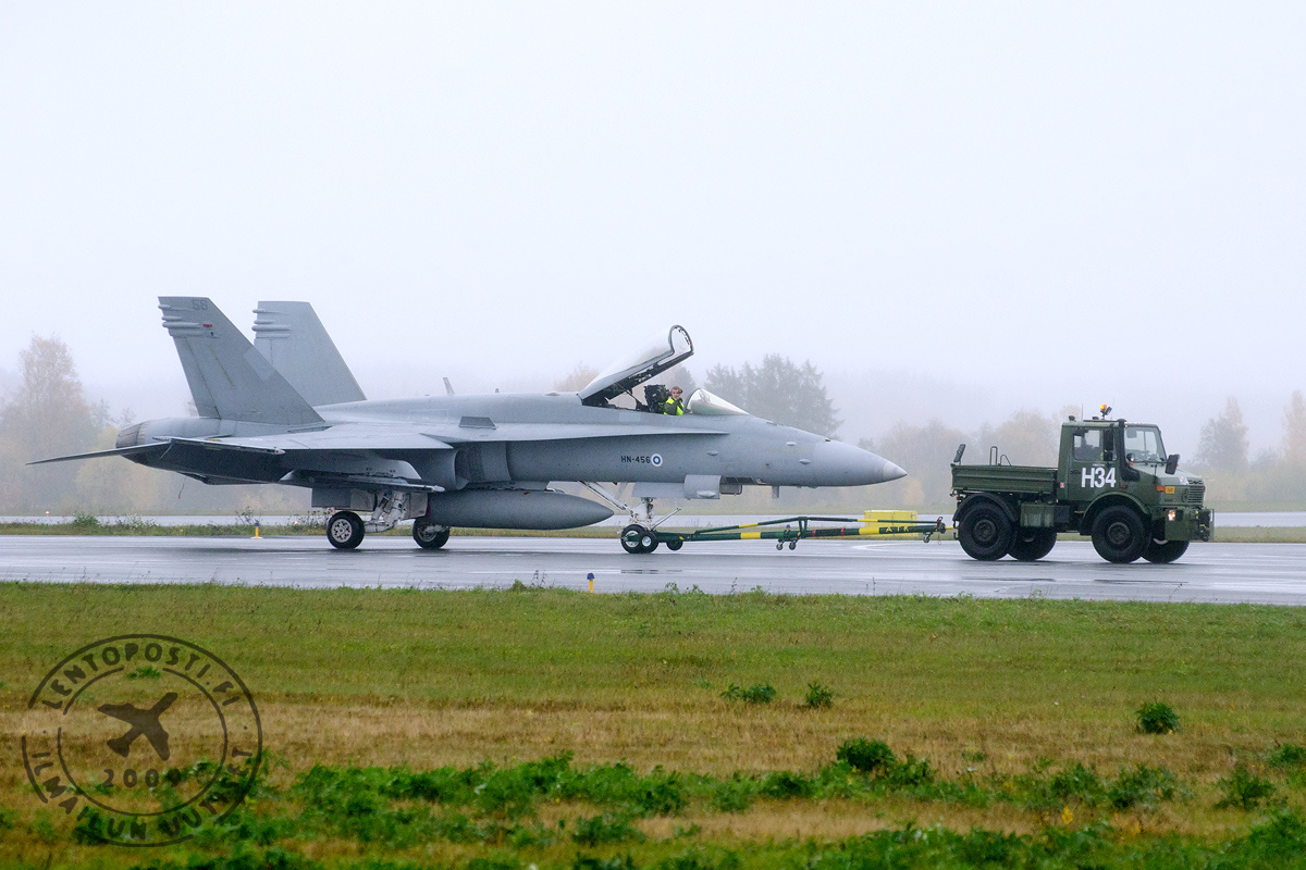 Puoliltapäivin laskuun palanneen Hornetin saapumista olivat varmistamssa Ilmavoimien ja Finavian pelastusyksiköt (oikealla, klikkaa kuvat suuremmaksi). Ohjaaja teki onnistuneen pysätysvaijerilaskun kiitotielle 33. Menetelmää käytetään mm. jarru- ja telinejärjestelmien vikatilanteissa normaalina varotoimena.