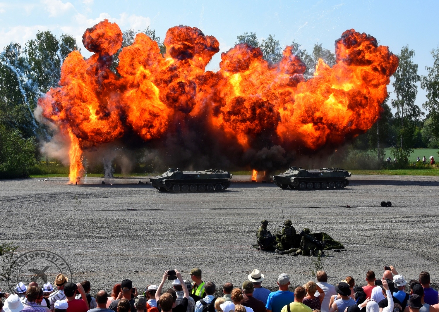 Päivän keskusteluihin osallistui myös Puolustusvoimien komentaja Jarmo Lindberg. Seuraamassa oli puolustusministeri Jussi Niinistö. Iltapäivällä oli vuorossa Puolustusvoimat 100 taistelunäytöskiertueen ensi-ilta Kirjurinluodossa (katso päivämäärät uutisen lopusta). Esityspaikka oli hieman piilossa Pori Jazz -tapahtuma-alueiden takana, mutta ystävälliset järjestyksenvalvojat ohjasivat sinne. Näytöksessä oli esillä pääosin maavoimien ohjuskalustoa kuten olalta laukaistava Raytheon FIM-92 Stinger -ilmatorjuntaohjus. Esityksessä yhdistettiin livetoiminta yleisön edessä ja etukäteen laadittu videokertomus kahdella suurella näytöllä. Yhdistelmä toimi hyvin jos oli päässyt paikalle josta screenit näkyivät. Videolla epäilyttävästi AH-64 Apache -taistelukopterilta näyttänyt ilma-alus hyökkäsi suomalaisten joukkojen kimppuun. Oikea ohjusryhmä meni asemaan ja laukaisi pyrotekniikan keinoin toteutettuna Stingerin. Videolla kopteri sai osuman ja putosi. Ilmavoimat oli ymmärrettävästi mukana ainoastaan virtuaalisesti. Hornetin ylilentoa oli harkittu , mutta sen ajoittaminen live-ohjelmaan sekä samaan aikaan lähistöllä käynnissä olleet suuret yleisötapahtumat johtivat tähän ratkaisuun. Maastosta maaleja virtuaali-Hornetille osoitti näytöksessä oikea JTAC-ilmatulenjohtaja (Joint Terminal Attack Controller). Hävittäjän lento ja aseen pudottaminen oli visualisoitu nykyisen digitaalitekniikan keinoin. Yleisö kuuli tulenjohtajan ja HN-ohjaajan välisen englanninkielisen radioliikenteen. Sitä oli luonnollisesti typistetty tositilanteeseessa käytettävästä, mutta termistö oli oikein. Kun GPS- ja inertiaohjattu JDAM-täsmäpommi (Joint Direct Attack Munition) oli irronnut koneesta, ohjaaja totesi "thirty seconds".