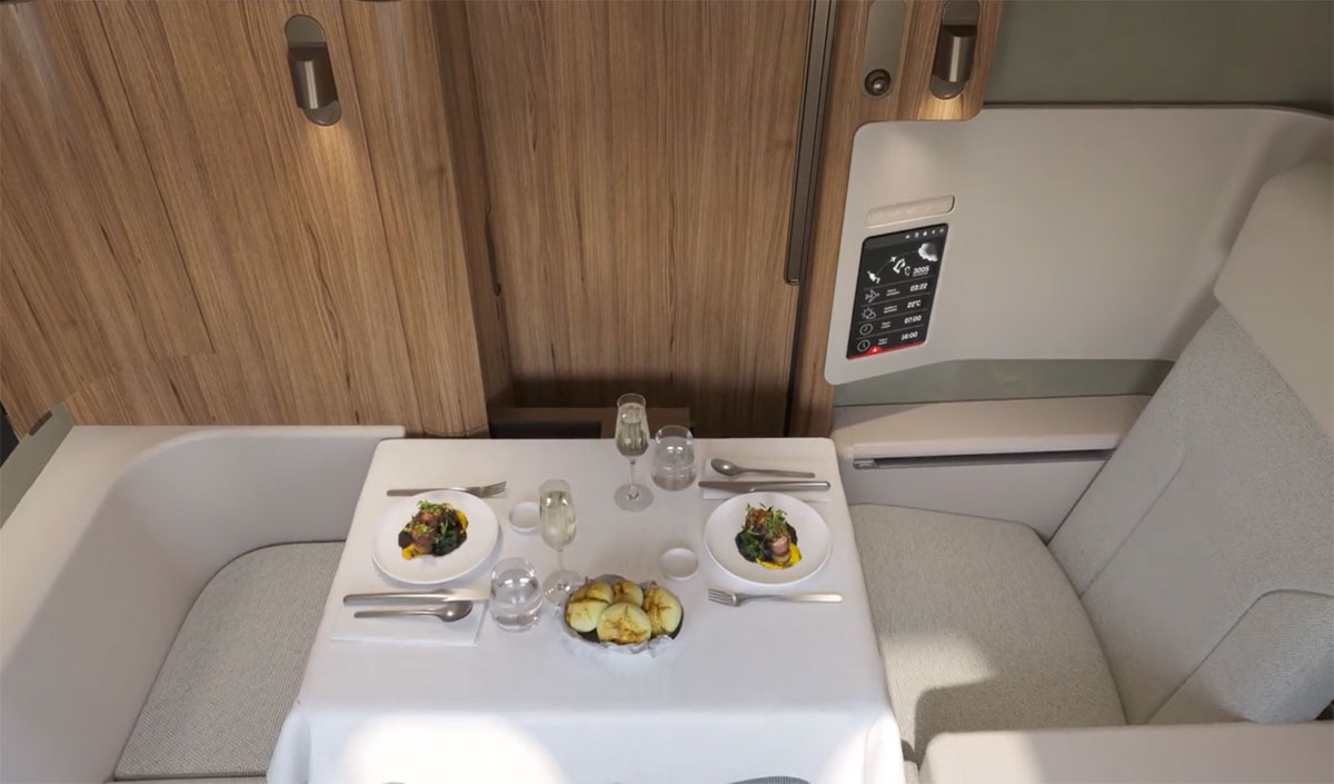 Tilassa on ruokapöytä kahdelle, erillinen 22 tuumaa leveä kallistuva istuin sekä kaksimetrinen sänky. Tarjolla on lisäksi 32-tuumainen kosketusnäyttö sekä tarpeelliset virtapistokkeet.